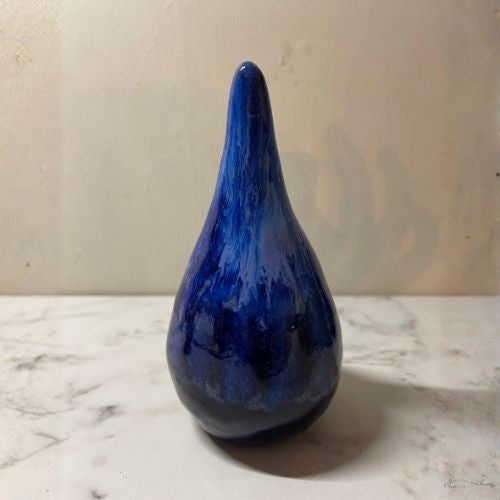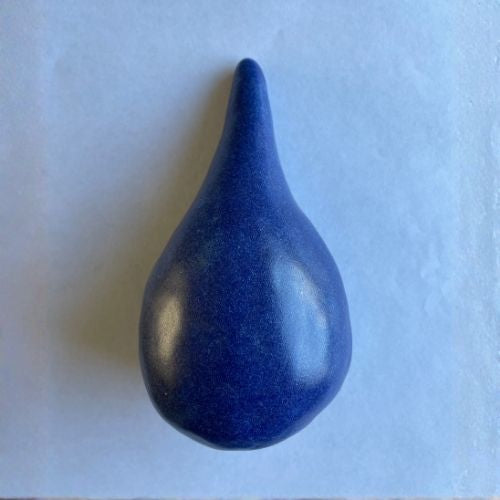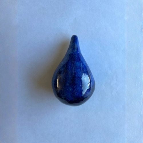 Voor deze drie unieke aandenkens mocht ik as verwerken van een bijzonder mens met een grote liefde voor water en sport. De druppelvorm, diepblauw van kleur, weerspiegelt zijn verbondenheid met het stromende en het vrije. Twee druppels krijgen een plek aan de muur, dicht bij huis. De derde, een staande druppel, reist mee naar Spanje — het land van zijn hart, en van zijn vrouw.